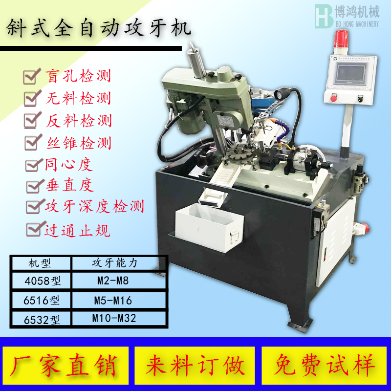 二、要了解有關(guān)攻絲機的能攻最大值是多少,一般要求是45號鋼,而且攻絲時深度要達到絲錐直徑的兩倍,并能一次性完成整個的攻絲過程。