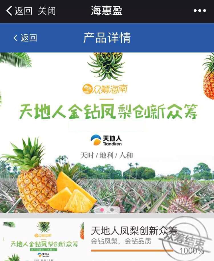 3月22日,海南股權交易中心天地人鳳梨創(chuàng)新眾籌項目圓滿結束,計劃眾籌金額10萬元,項目上線僅5分鐘,成功募集金額100萬元,是預期目標金額的10倍。天地人鳳梨眾籌項目,是股交中心2018年在?;萦脚_上線的首單創(chuàng)新...
