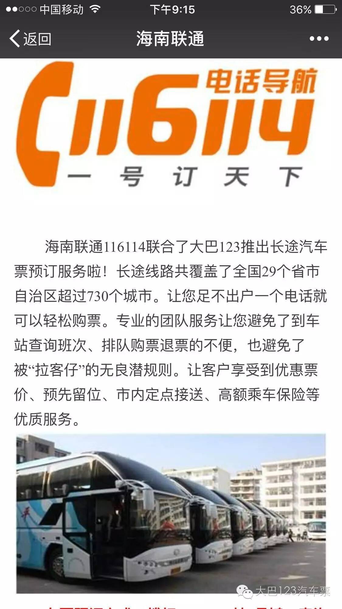 如今,大巴123汽車票與海南聯(lián)通116114合作了,不僅可以在微信上購買汽車票,也可以用電話預(yù)定汽車票。