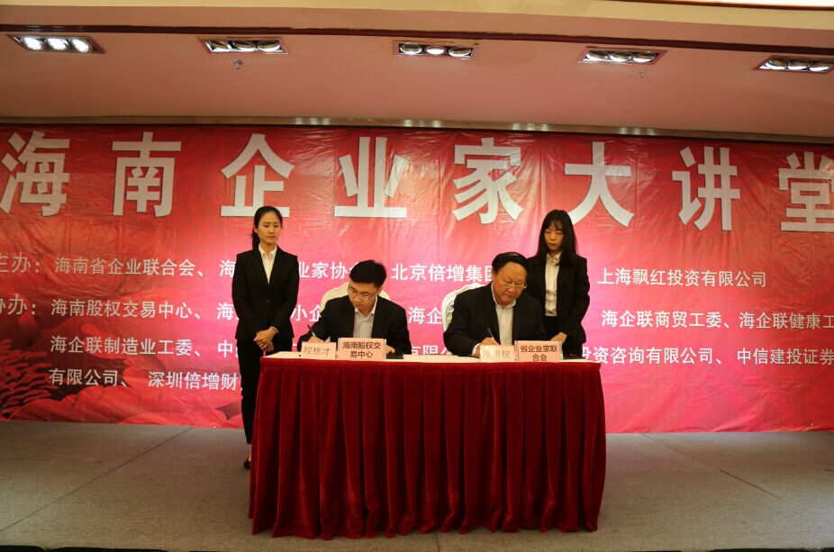 3月28日下午,2016“海南企業(yè)家大講堂”在海南寰島泰得大酒店舉行,海南股權(quán)交易與海南省企業(yè)聯(lián)合會(huì) 及海南省企業(yè)家協(xié)會(huì)共同簽署了戰(zhàn)略合作協(xié)議。三方合作,助力海南中小微企業(yè)發(fā)展。