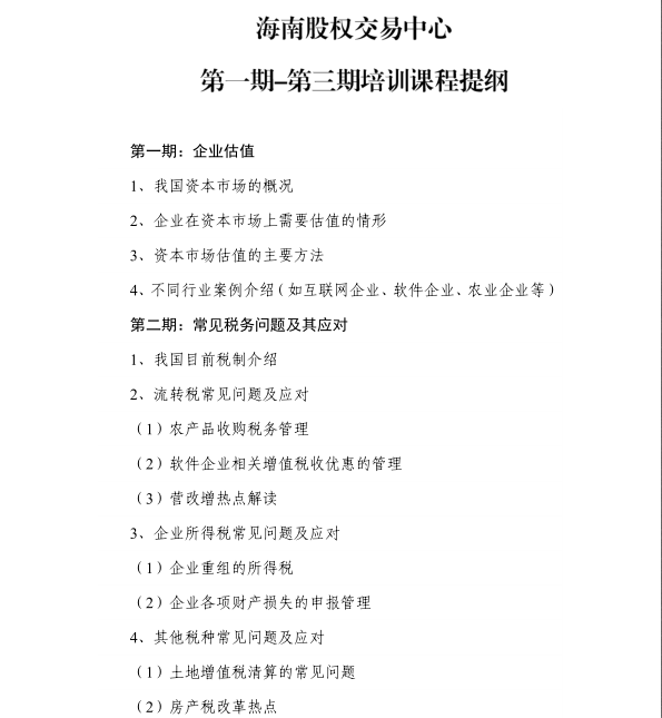 為幫助掛牌企業(yè)解決資金、稅收、以及管理上存在的諸多問(wèn)題,提升企業(yè)的專業(yè)水平和管理水平,實(shí)現(xiàn)全方位成長(zhǎng)壯大,海南股權(quán)交易中心(以下簡(jiǎn)稱“股交中心”)掛牌企業(yè)培訓(xùn)班正式開(kāi)班。首期培訓(xùn)班,股交中心特邀請(qǐng)中審亞太會(huì)計(jì)師事務(wù)所(特殊普通合伙)專家提供法律、財(cái)務(wù)和管理等方面的免費(fèi)培訓(xùn)服務(wù),通知如下: