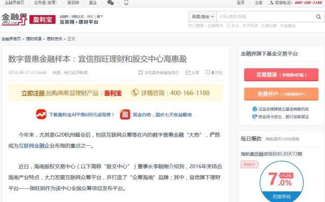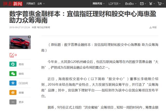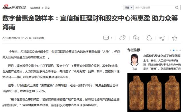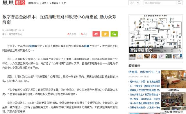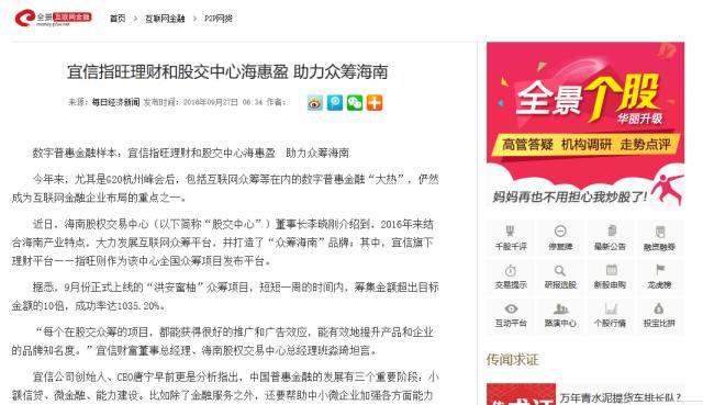 9月23日,海南股權交易中心在椰城海口舉辦“數(shù)字金融在海南暨互聯(lián)網(wǎng)+農(nóng)業(yè)研討會”,研討會上討論了多項重要議題,尤其是“眾籌海南”項目,受到了高度關注。國內(nèi)主流財經(jīng)媒體《每日經(jīng)濟新聞》以《數(shù)字普惠金融樣本:宜信指旺理財和股交中心?;萦Ρ娀I海南》對本次研討會做了重要報道,文章刊發(fā)后,被新浪、網(wǎng)易、金融界、鳳凰、全景網(wǎng)、同花順財經(jīng)等主流媒體網(wǎng)站轉載。