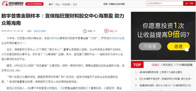 近日,海南股權交易中心(以下簡稱“股交中心”)董事長李曉剛介紹到,2016年來結合海南產(chǎn)業(yè)特點,大力發(fā)展互聯(lián)網(wǎng)眾籌平臺,并打造了“眾籌海南”品牌;其中,宜信旗下理財平臺——指旺則作為該中心全國眾籌項目發(fā)布平臺。