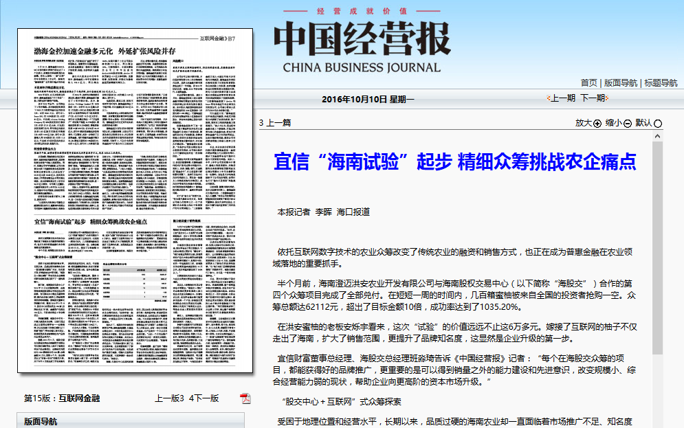 近日,國內(nèi)最早發(fā)行經(jīng)濟類的報刊之一《中國經(jīng)營報》在其互聯(lián)網(wǎng)金融版上報道“眾籌海南”,文章以《宜信“海南試驗”起步 精細(xì)眾籌挑戰(zhàn)農(nóng)企痛點》為題,表示依托互聯(lián)網(wǎng)數(shù)字技術(shù)的農(nóng)業(yè)眾籌改變了傳統(tǒng)農(nóng)業(yè)的融資和銷售方式,也正在成為普惠金融在農(nóng)業(yè)領(lǐng)域落地的重要抓手。