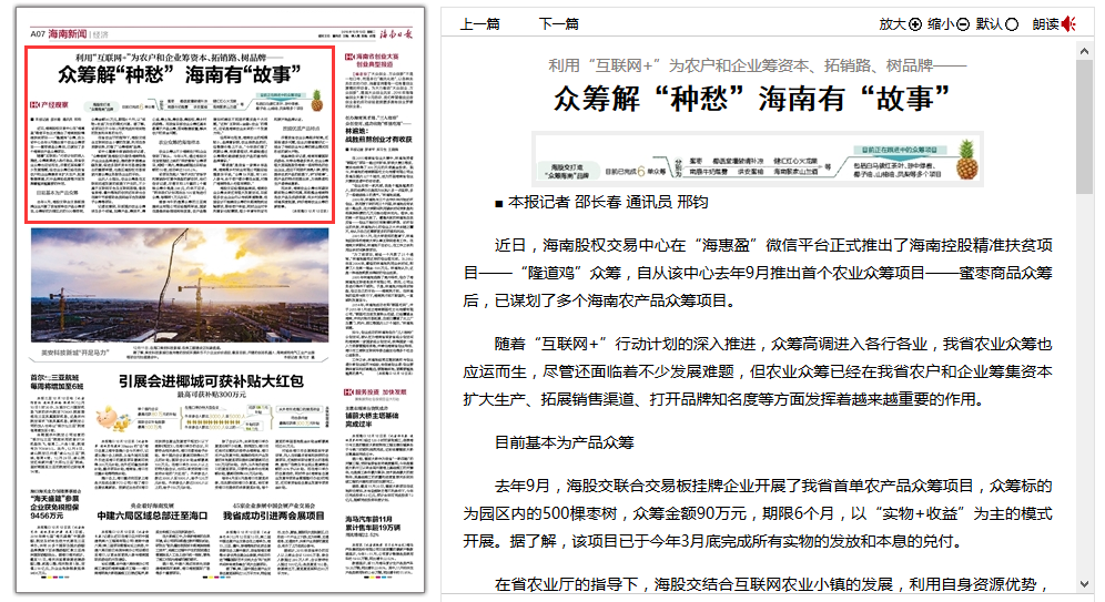 12月13日,海南日?qǐng)?bào)在經(jīng)濟(jì)版刊發(fā)文章《利用“互聯(lián)網(wǎng)+”為農(nóng)戶和企業(yè)籌資本、拓銷路、樹(shù)品牌——眾籌解“種愁”海南有“故事”》,大篇幅報(bào)道了海南股權(quán)交易中心“眾籌海南”。