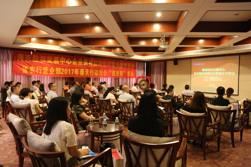 3月30日上午,由海南股權(quán)交易中心和中國(guó)農(nóng)業(yè)銀行海南省分行營(yíng)業(yè)部共同主辦的企業(yè)集體掛牌儀式暨銀企對(duì)接會(huì),在中國(guó)農(nóng)業(yè)銀行??跒持许樌e行。海南股權(quán)交易中心副總經(jīng)理程棟才,中國(guó)農(nóng)業(yè)銀行海南省分行營(yíng)業(yè)部總經(jīng)理林道冠、副總經(jīng)理林敏,中國(guó)農(nóng)業(yè)銀行海南省分行小微企業(yè)部副總經(jīng)理陳沖,以及50家企業(yè)代表共同參加本次對(duì)接會(huì)。