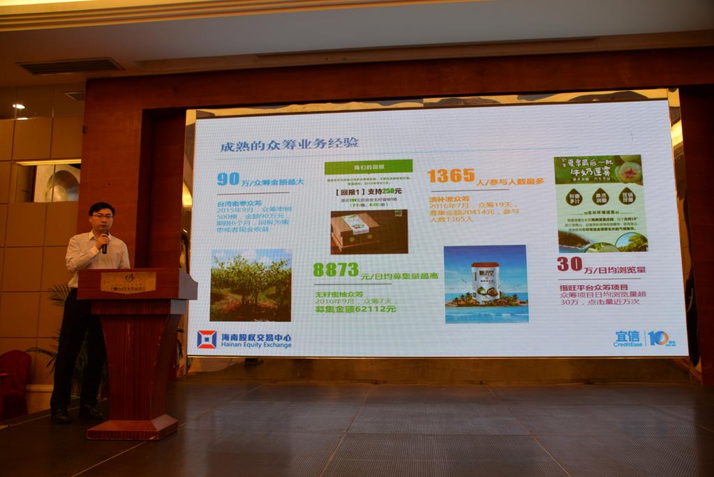 隨后,股交中心副總經(jīng)理程棟才就2017年度“眾籌海南,訂制農(nóng)旅”項(xiàng)目情況及具體內(nèi)容作了詳細(xì)的介紹,指出此次股交中心推出“眾籌海南,訂制農(nóng)旅”項(xiàng)目目的在于聚焦海南特色資源,推廣海南特色農(nóng)產(chǎn)品,促進(jìn)農(nóng)旅融合,進(jìn)一步推動(dòng)企業(yè)發(fā)展。