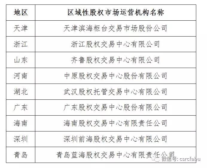 根據(jù)《國務院辦公廳關于規(guī)范發(fā)展區(qū)域性股權市場的通知》(國辦發(fā)〔2017〕11號)、《區(qū)域性股權市場監(jiān)督管理試行辦法》(證監(jiān)會令第132號)有關規(guī)定,區(qū)域性股權市場運營機構名單由省級人民政府實施管理并予以公告,同時向證監(jiān)會備案。自2018年4月27日公示《全國區(qū)域性股權市場運營機構備案名單(第一批)》以來,9個地區(qū)按規(guī)定要求向我會備案區(qū)域性股權市場運營機構情況。具體名單如下: