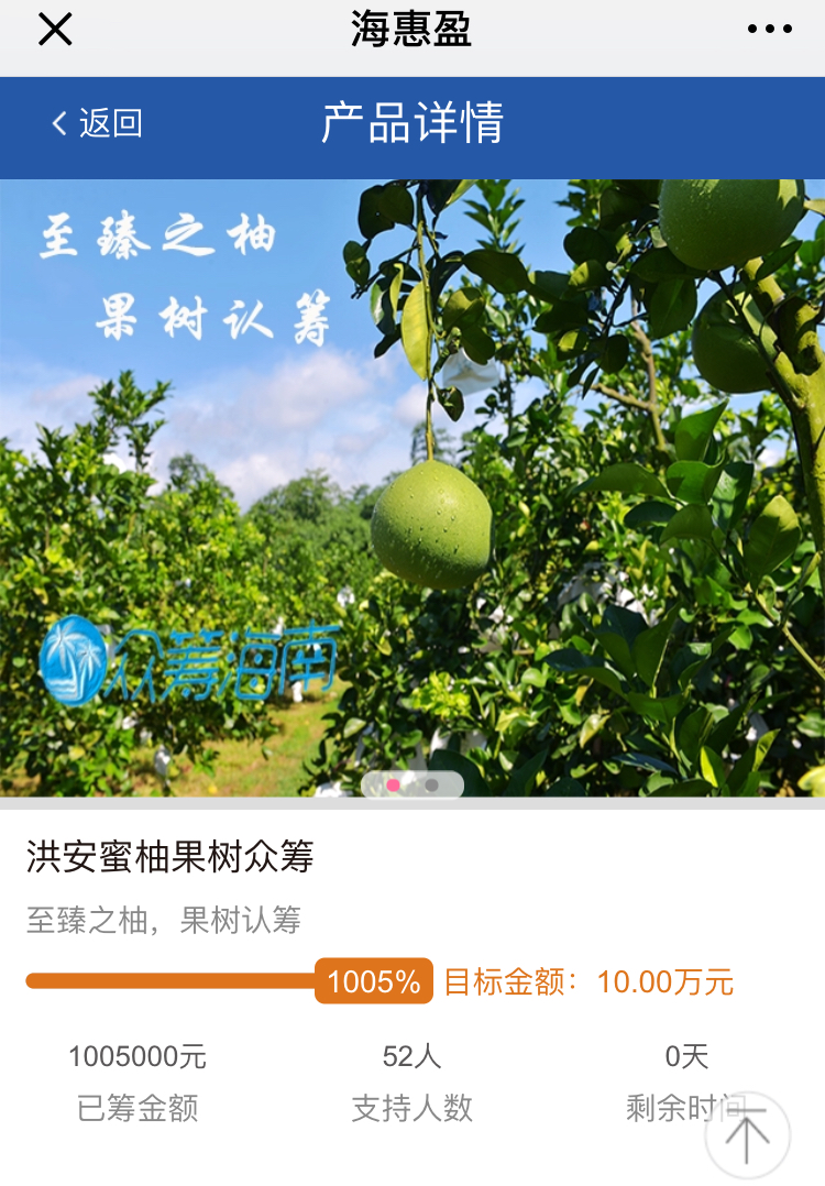 去年底,為了幫助企業(yè)解決短期資金流轉(zhuǎn)問題,海南股權(quán)交易中心聯(lián)合掛牌企業(yè)澄邁洪安農(nóng)業(yè)開發(fā)有限公司發(fā)起了存續(xù)期為9個(gè)月的“洪安蜜柚果樹眾籌”項(xiàng)目,項(xiàng)目在股交中心綜合金融服務(wù)平臺(tái)“?;萦卑l(fā)布后短時(shí)間內(nèi)達(dá)成了募集資金目標(biāo),最終募集金額達(dá)100.5萬元。