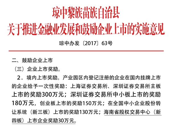 為扶持中小微企業(yè)對(duì)接資本市場(chǎng),鼓勵(lì)企業(yè)上市、掛牌和融資。瓊中縣政府印發(fā)《瓊中黎族苗族自治縣關(guān)于推進(jìn)金融業(yè)發(fā)展和鼓勵(lì)企業(yè)上市的實(shí)施意見(jiàn)》(瓊中辦〔2017〕63號(hào)),意見(jiàn)指出,對(duì)在區(qū)域性股權(quán)交易市場(chǎng)掛牌的瓊中縣注冊(cè)登記的企業(yè),給予一次性獎(jiǎng)勵(lì)30萬(wàn)元(適用于完成股改并在海南股交交易板掛牌的瓊中縣企業(yè))。