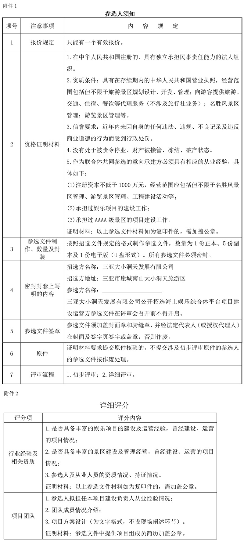 根據(jù)相關(guān)法律法規(guī),受委托,海南股權(quán)交易中心有限責(zé)任公司公開招選海上娛樂綜合體平臺項目建設(shè)運營方,為三亞大小洞天景區(qū)的海上娛樂綜合體平臺項目提供盡職調(diào)查、項目報批、建設(shè)、生產(chǎn)、安裝、調(diào)試、驗收及運營管理等服務(wù)工作。歡迎符合條件的機(jī)構(gòu)遵照本公告的有關(guān)規(guī)定報名參加,現(xiàn)將有關(guān)事項公告如下: