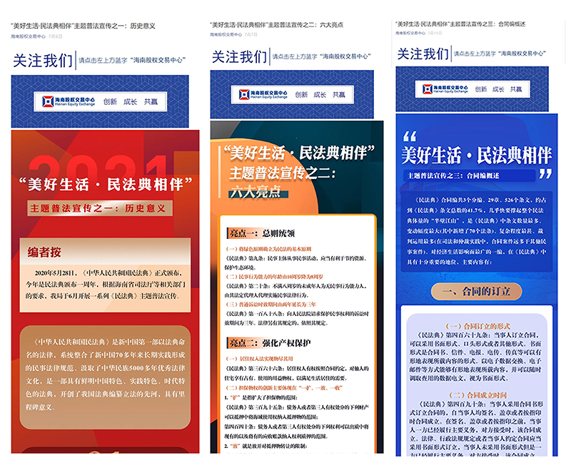 2021年7月7日-29日期間,海南股交通過(guò)邀請(qǐng)知名專家、投資機(jī)構(gòu)進(jìn)行線上授課和微信公眾號(hào)平臺(tái)轉(zhuǎn)發(fā)“民法典主題普法宣傳”等形式,開展企業(yè)培育宣傳活動(dòng)。其中,線上課程向掛牌公司、展示企業(yè)、托管企業(yè)尤其是“專精特新”企業(yè)定向邀約,邀請(qǐng)企業(yè)代表參加《“商業(yè)計(jì)劃書”系列課程》兩堂線上直播課,直播課在線參與人數(shù)922名,活動(dòng)取得了良好效果。