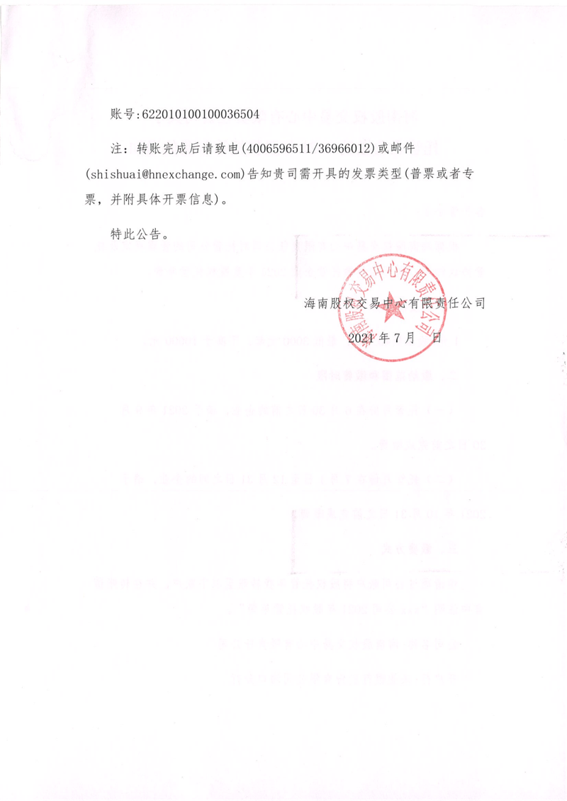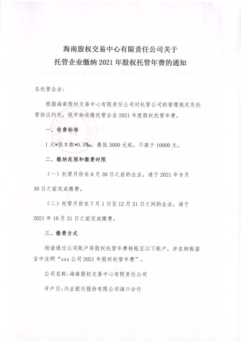 海南股權(quán)交易中心有限責(zé)任公司關(guān)于托管企業(yè)繳納2021年股權(quán)托管年費的通知
