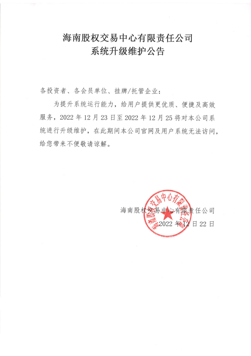 海南股權交易中心有限責任公司系統(tǒng)升級維護公告