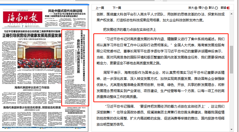 3月7日,海南日報頭版發(fā)布文章《奮躍而上推動高質(zhì)量發(fā)展——習(xí)近平總書記在參加江蘇代表團(tuán)審議時的重要講話,在我省代表委員中引起熱烈反響》。文章指出:習(xí)近平總書記在參加江蘇代表團(tuán)審議時強(qiáng)調(diào)“高質(zhì)量發(fā)展是全面建設(shè)社會主義現(xiàn)代化國家的首要任務(wù)”,在住瓊?cè)珖舜蟠怼⑷珖f(xié)委員中引起熱烈反響。