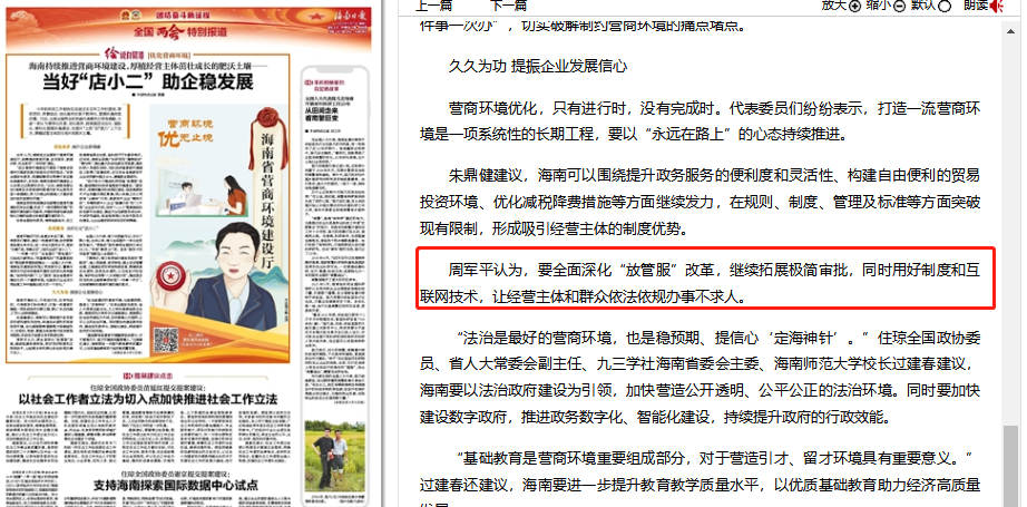3月7日,海南日報發(fā)布文章《當(dāng)好“店小二”助企穩(wěn)發(fā)展—— 海南持續(xù)推進(jìn)營商環(huán)境建設(shè),厚植經(jīng)營主體茁壯成長的肥沃土壤》。文章指出:今年的政府工作報告在總結(jié)過去五年工作時提到,簡政放權(quán)、放管結(jié)合、優(yōu)化服務(wù)改革不斷深化,營商環(huán)境明顯改善。對此,出席全國兩會的我省代表委員們深有感觸。