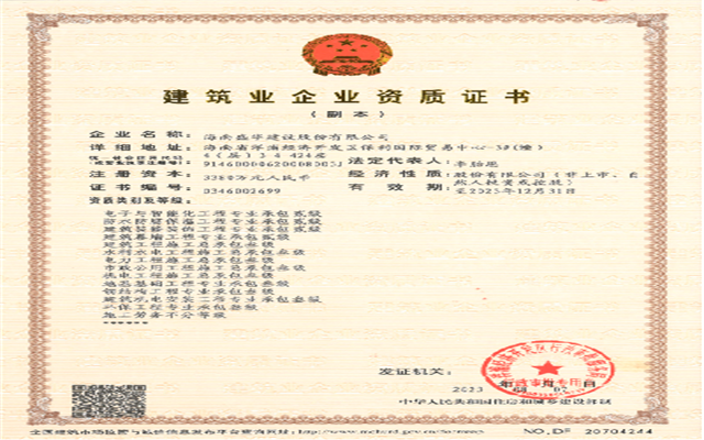 | 主營業(yè)務: | 消防工程配套設備的安裝、調試、設計,消防設施維護保養(yǎng)檢測,項目代建,建筑工程,土木工程,水利水電工程,河道疏浚,室內外裝修裝飾工程設計施工,水電安裝工程,中央空調安裝工程,電子與智能化工程設計施工,機電設備安裝工程,環(huán)保工程,公路工程,市政公用工程,電力工程,防雷工程設計施工,防雷裝置的檢測,園林綠化工程設計施工,通信工程,通信設備維修,鋼結構工程,人防工程,古建筑工程,古建筑維修,建筑機械租賃及銷售,船舶設施制造、維修,消防器材批發(fā)、零售及維修。 |