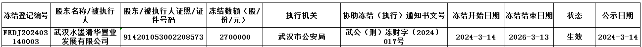 依據(jù)武漢市公安局《協(xié)助凍結(jié)財(cái)產(chǎn)通知書(shū)》[武公(刑)凍財(cái)字〔2024〕017號(hào)]文件,我中心為海南瓊中長(zhǎng)江村鎮(zhèn)銀行股份有限公司(企業(yè)代碼:893525)股東武漢水墨清華置業(yè)發(fā)展有限公司辦理股權(quán)凍結(jié)登記,具體情況如下: