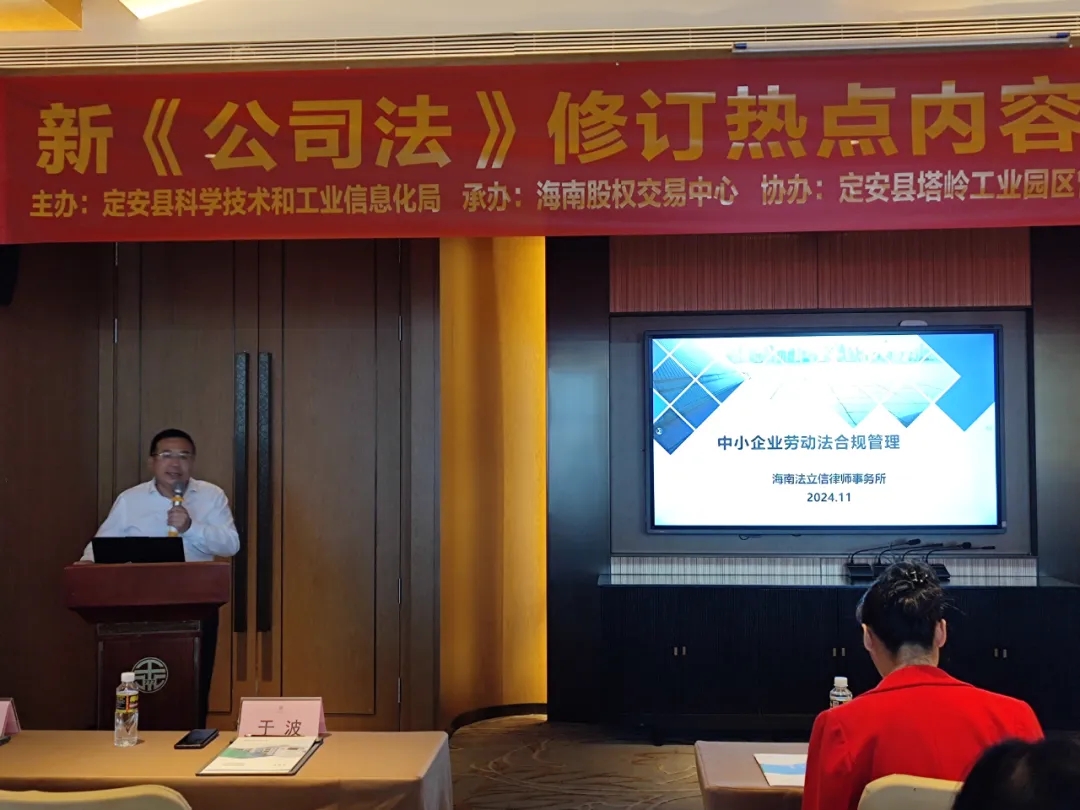 本次培訓(xùn)旨在深入解讀新《公司法》修訂熱點(diǎn)內(nèi)容和《勞動(dòng)法》的核心內(nèi)容,探討企業(yè)合規(guī)管理策略,助力企業(yè)健康發(fā)展?;顒?dòng)由定安縣科學(xué)技術(shù)和工業(yè)信息化局主辦,海南股權(quán)交易中心承辦,定安縣塔嶺工業(yè)園區(qū)管理委員會(huì)、定安縣工商業(yè)聯(lián)合會(huì)協(xié)辦,海南法立信律師事務(wù)所提供支持。
